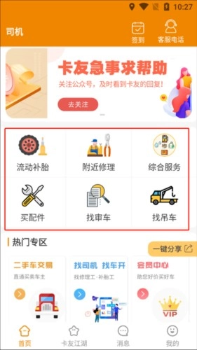 【主页】提供丰富服务:流动补胎、附近修理、配件购买、综合服务,还能帮您找审车与吊车,全方位快速解决您路途中的各类难题。此外,设有二手车交易板块,助您以更优价格买卖二手车;更有招聘求职服务,有效解决您招司机或找工作困难的问题。
