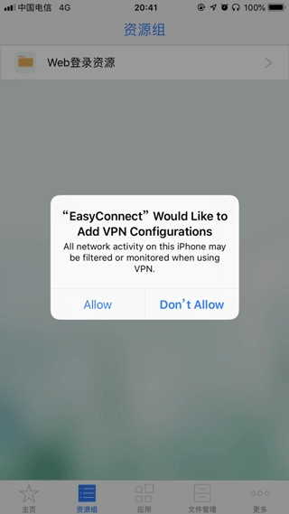 3、首次登录VPN时,可能会弹出以下英文提示,此时请选择“Allow”。紧接着,系统会自动跳转到网络连接请求界面,在此界面点击“确定”即可完成验证。