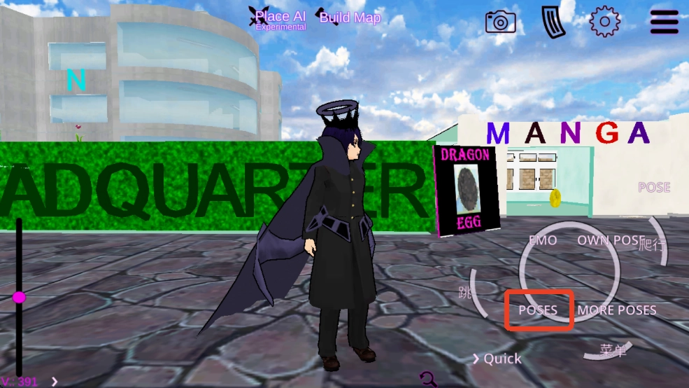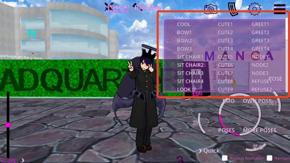 7、点击“POSES”,人物就能做出各类姿势,像可爱的姿势、胜利的姿势、害羞的姿势,还有敬礼的姿势等等。
