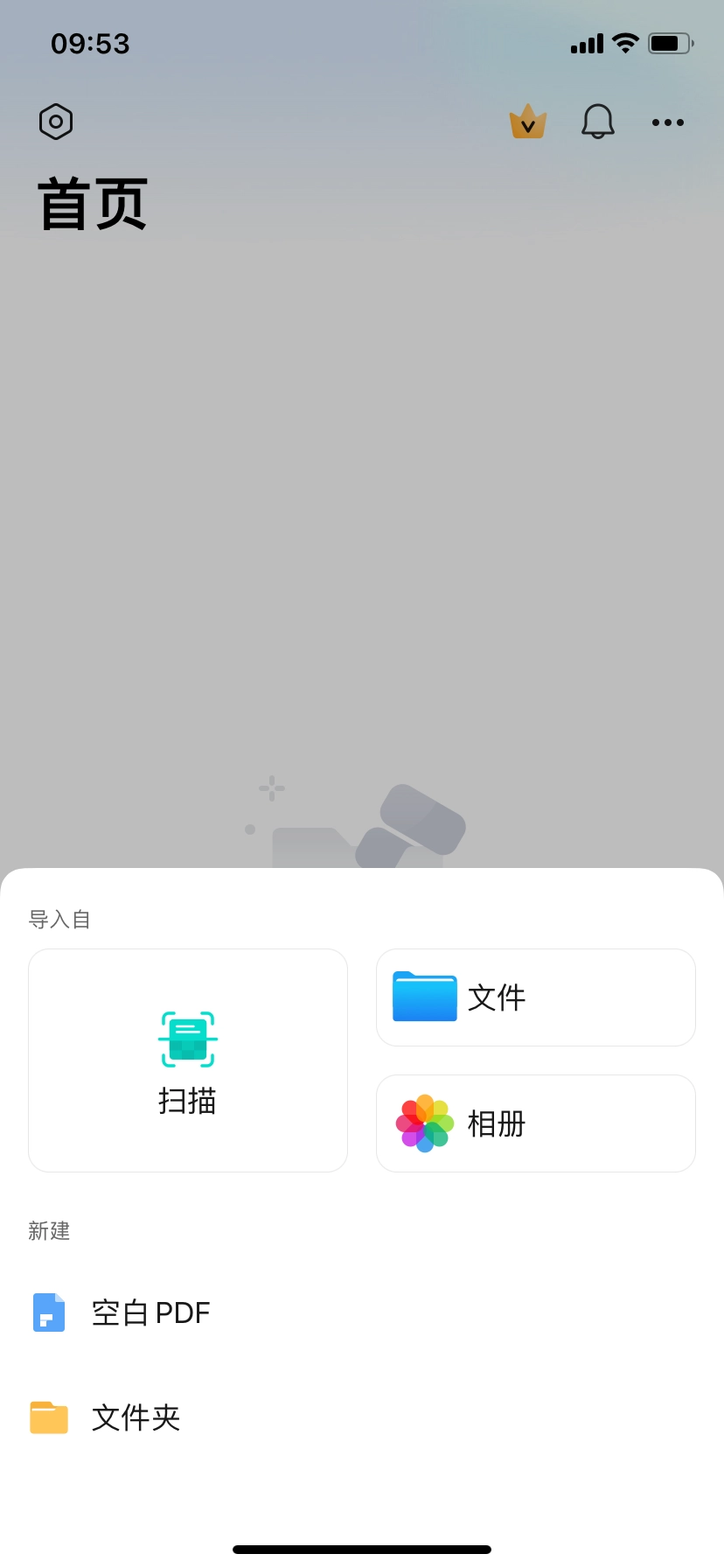 2、在首页栏目,用户可根据需求导入扫描、文件、相册等内容或者新建PDF和文件夹,