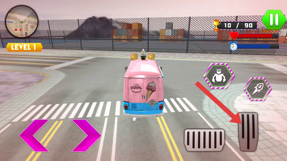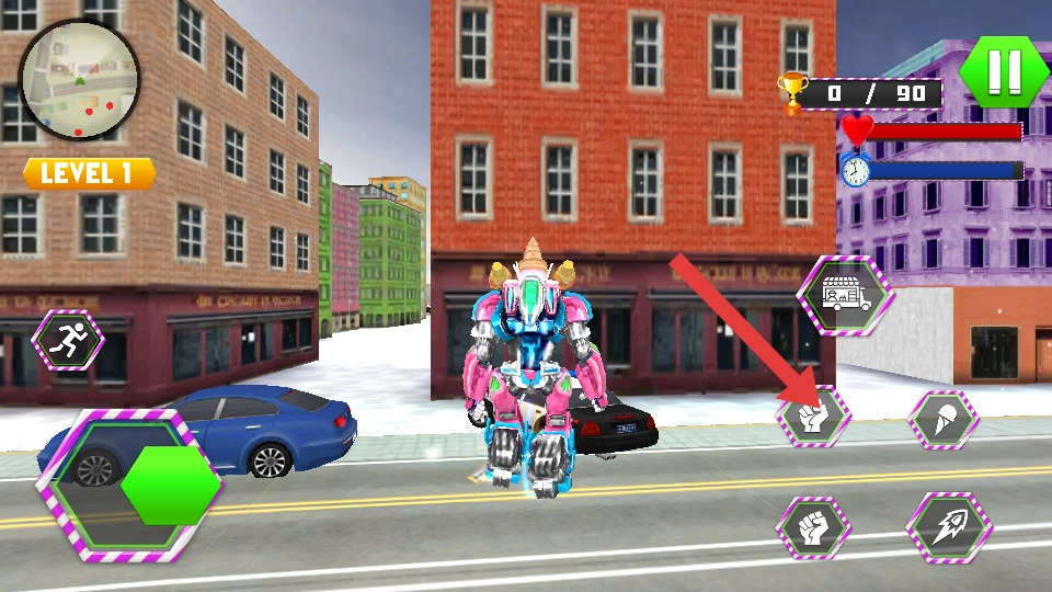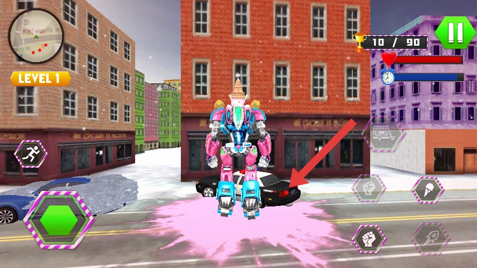 3、推进过程中,点击变形按钮可将机器人变为冰淇淋车,借助车辆形态在街道灵活移动,探索不同区域,完成收集目标。