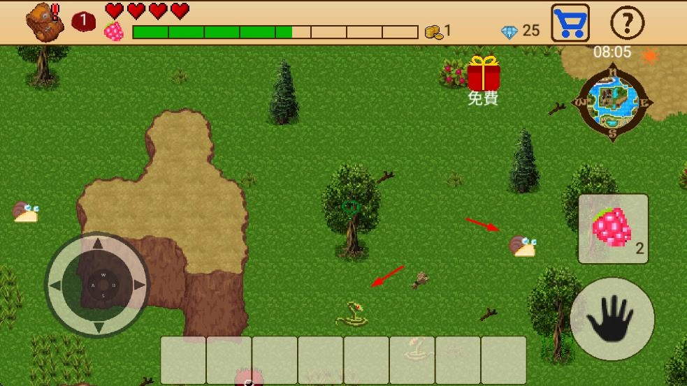 1. 在野外探索时,操控角色去采集树莓、捕捉蜗牛,并打败蛇类,以此来积攒基础资源。