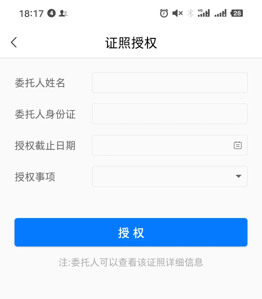 点击右上角菜单,点击【发起授权】,输入对应用户姓名、身份证、授权日期给其他用户进行证照授权。