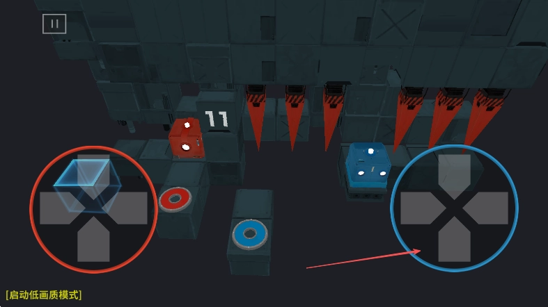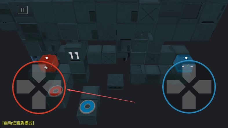 1. 进入游戏后,借助左侧红色虚拟按键来操控红色方块移动,同时要留意场景中方块的布局以及“11”数字标识。