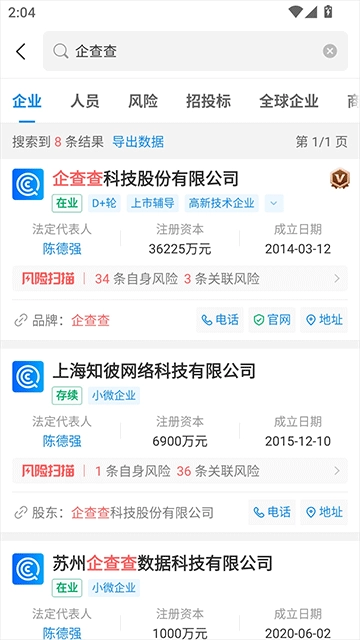 2、从搜索结果中选择目标企业,点击进入 详情页面