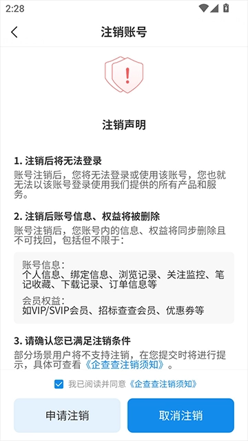 5、勾选“我已阅读并同意《企查查注销须知》”,点击“申请注销”