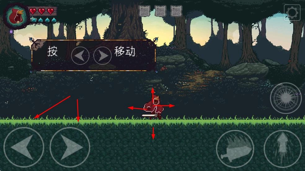 1. 通过左右虚拟按键操控角色移动,在森林场景中展开探索,同时要留意场景中的地形以及可互动的点位。