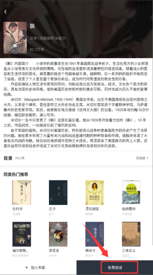 2、点击书籍封面进入详情页,查看作品简介和章节信息后选择"免费阅读"选项。