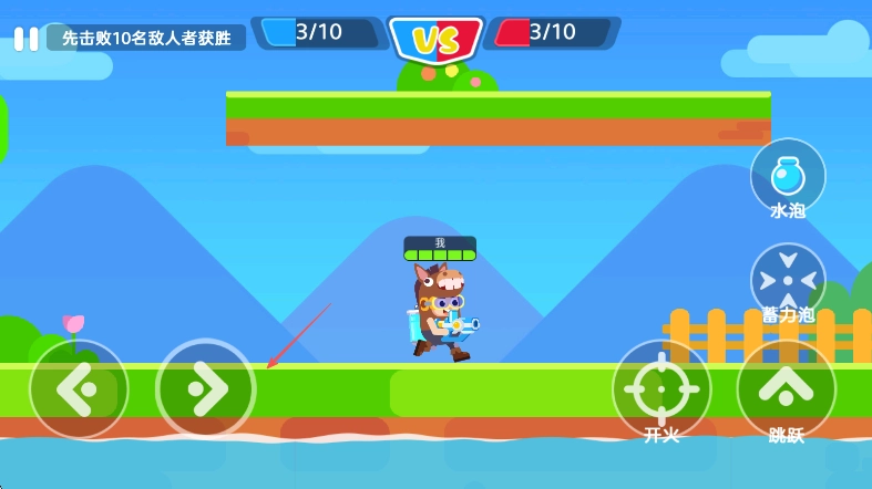 1. 开启游戏,确定以率先击败10名敌人为获胜目标。通过左下角的方向键来操控角色移动,同时留意敌人所处位置,随时准备使用右侧的开火键发起攻击。