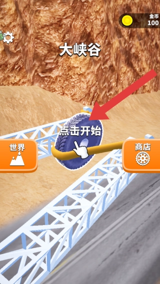 1. 此场景设定在大峡谷关卡,页面设有点击开始按钮,以及世界、商店功能的入口。只有点击开始按钮,才能开启相关操作,该页面主要用于在开始前选择关卡与功能。