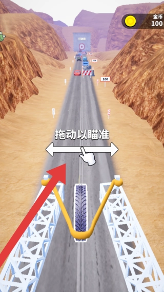 2、呈现拖动以瞄准的操作提示,场景设定在大峡谷赛道,赛道中有金币显示,此环节属于轮胎弹射前的瞄准准备阶段。