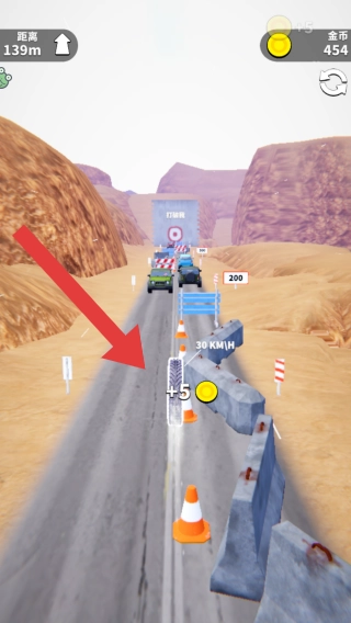 3、展现出大峡谷赛道的场景,其中距离为139m,场景内设有道路障碍锥桶、石墩等障碍物,还有车辆,此部分属于轮胎滚动闯关的游戏玩法(gameplay)环节。