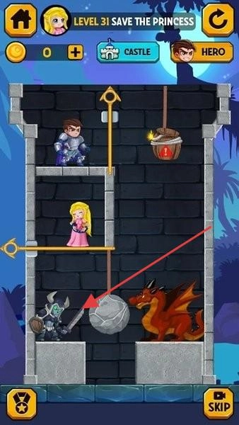 2、在救公主关卡(LEVEL31)中,留意机关(绳子、石块),点击将其移除,使英雄避开危险,成功救出公主。