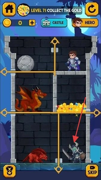 3、夺金关卡(LEVEL71):需规划机关(横杆)的操作顺序,在过程中巧妙避开恶龙与敌人,从而引导英雄成功获取金币。