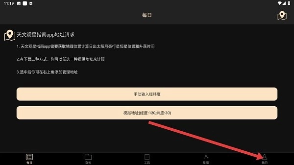 工具包含:事件、每日一图、晴天钟、流星雨、行星现象以及光污染地图。