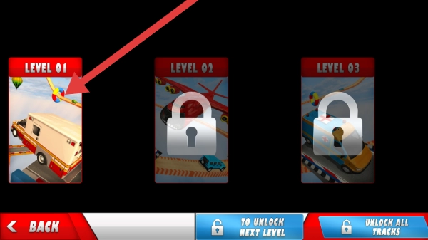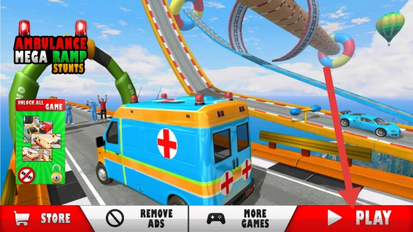 1. 在游戏的主界面,点击【PLAY】,进而进入【AMBULANCEMEGARAMPSTUNTS】的特技挑战环节。
