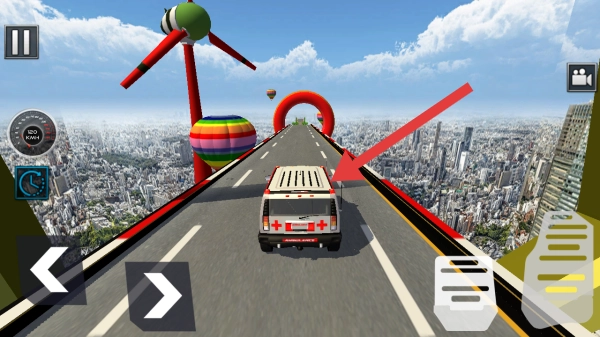 3、操控救护车行驶在高空坡道上,把控好方向,避开障碍物,冲破圆环等,完成一系列特技动作。过程中要留意速度与平衡的把控。
