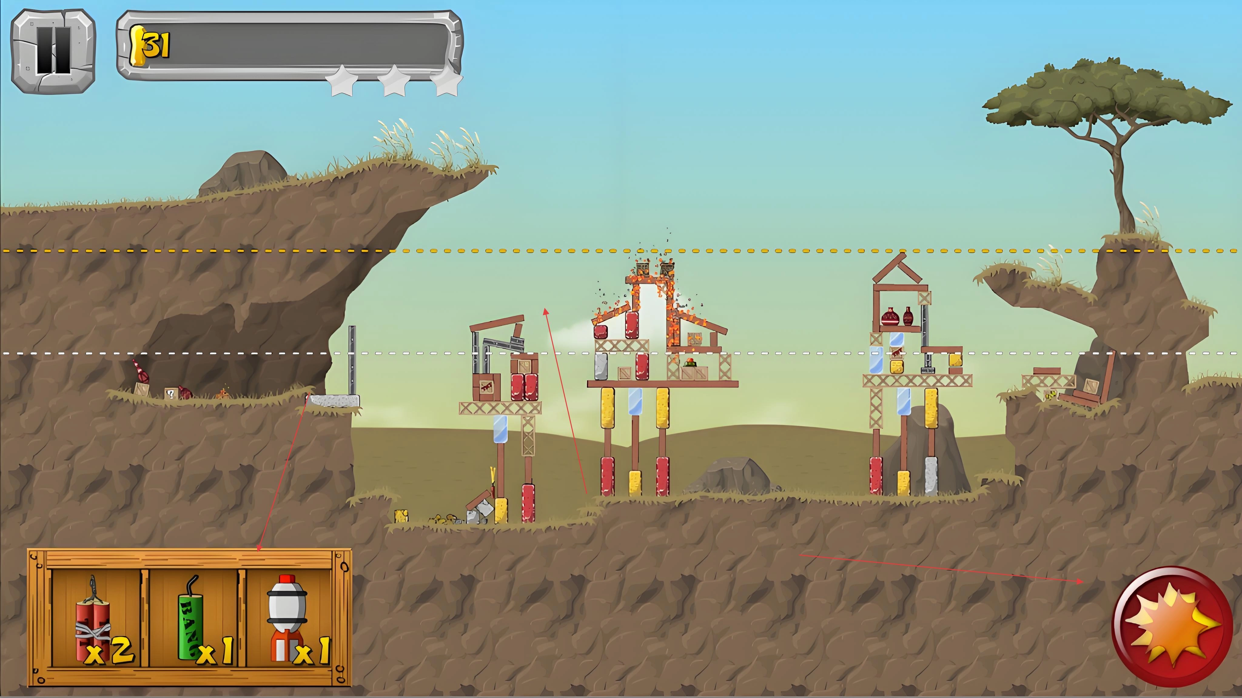 2、爆破策略规划:采用dynamite进行爆破作业时,按照「三角形布点法」来放置炸药。具体布局为底层设置3处炸药,中层布置2处炸药,顶层放置1处炸药。通过这样的布点方式,能够使建筑朝着指定方向平稳地倒塌。