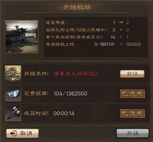 校场这一建筑,主要作用在于储存经验。但有一点绝不能忽视!当校场达到特定等级时,能够提高出征队列的上限。出征队列增多,便能同时向多个目标点发兵,效率会得到极大提升。因此,校场无需每次都优先升级,不妨将其往后放一放,进行一次性升级。至于如何把握这个度,就需要各位自行斟酌了。