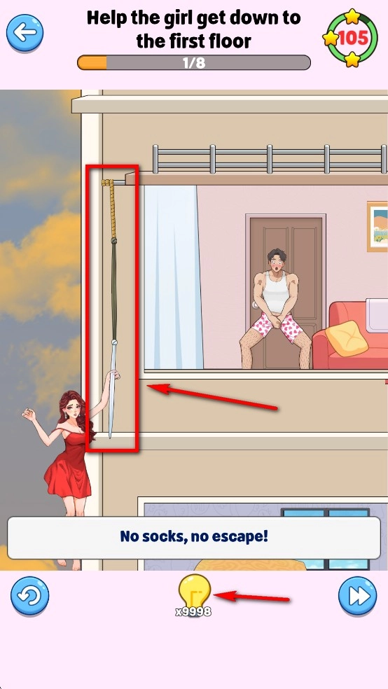 如图,持续延长,最终使女友安全落地。要是不清楚下一步该怎么做,可点击灯泡获取提示。