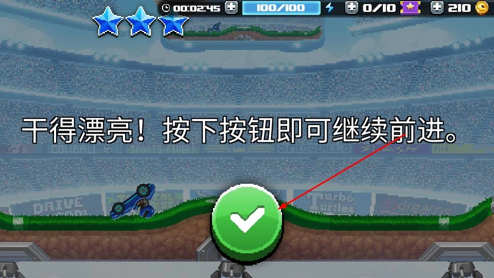 3、顺利通过赛道后,点击绿色对勾按钮完成结算,随后即可继续推进游戏,开启新的竞速关卡,挑战更多复杂赛道。