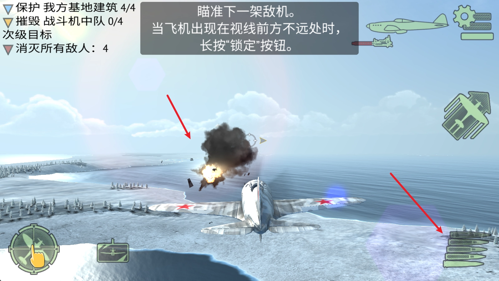 3、点击左下角的瞄准按钮即可锁定敌人的飞机。