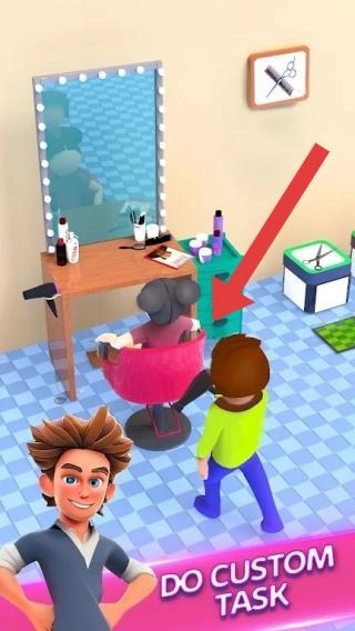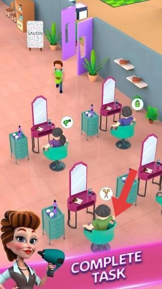 2、展现理发店的经营场景,场景中有顾客和员工。玩家能够开展服务客户、店铺管理等操作,需通过完成任务(COMPLETETASK)来经营沙龙。