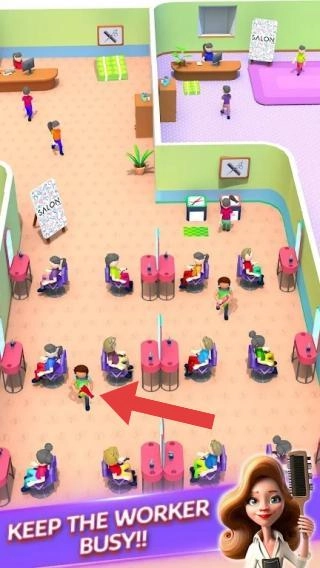 3、展现沙龙的经营画面,其中包含顾客与员工。文字提示要体现出让员工处于忙碌状态,玩家需要合理调度员工为顾客提供服务,进而管理好沙龙。