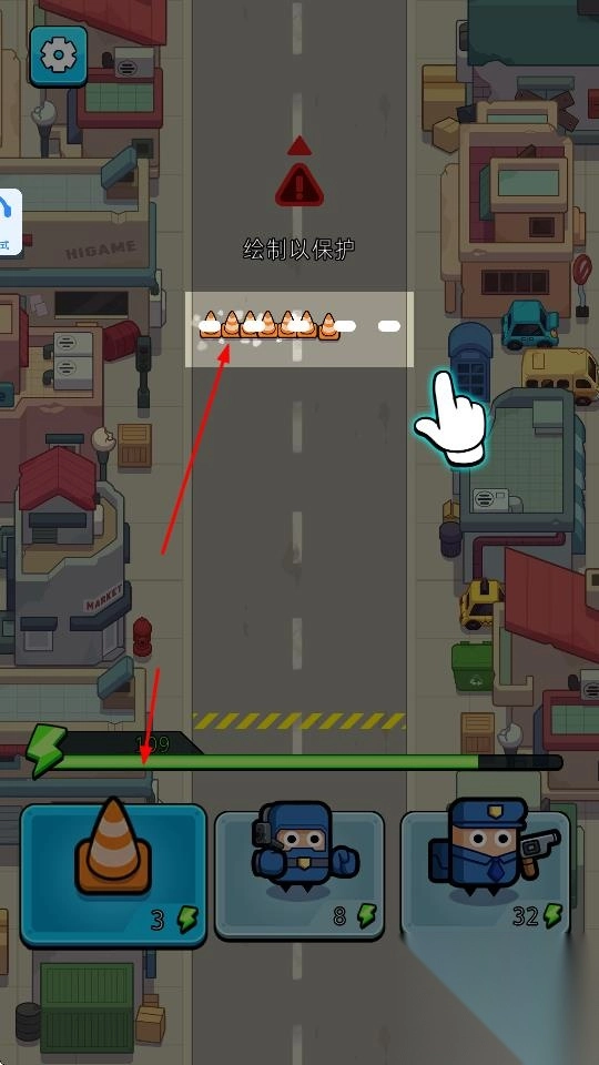 1. 轻点“绘制以保护”,耗费能量布置路障(锥形桶),阻拦僵尸前行路径,保卫城市。