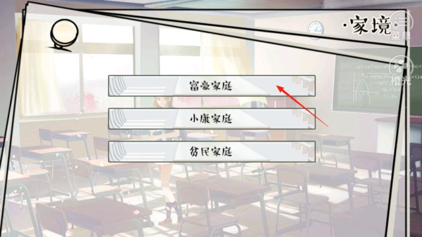 1. 来到家境选择界面,这里展示着三种家庭背景。轻点“富豪家庭”选项,以此确定初始家境。借助背景设定这一机制,后续剧情会受到相应影响。通过这一系列操作,为角色奠定基础,从中感受开局选择的重要意义。
