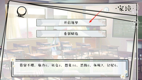 2、完成家境选择后,会出现“开启逐梦”与“重新赋值”两个选项。点击“开启逐梦”,即可借助流程推进机制推进剧情,进而进入主线故事。随后通过相关操作,依据初始属性展开冒险,由此体验角色成长的起始阶段。