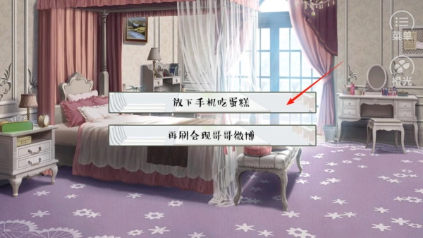 3、来到卧室场景,点击“放下手机吃蛋糕”选项,即可触发相应剧情。利用日常抉择机制,打造角色的生活轨迹。通过具体操作,体验因不同选择而产生的情节分支,领略互动叙事的独特魅力。