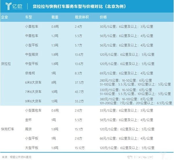 (4)小型货车,价格58.0元(行驶5公里),长2.7米、宽1.4米、高1.2米,载重1.5吨,超出5公里后,超公里费为4.0元/公里。