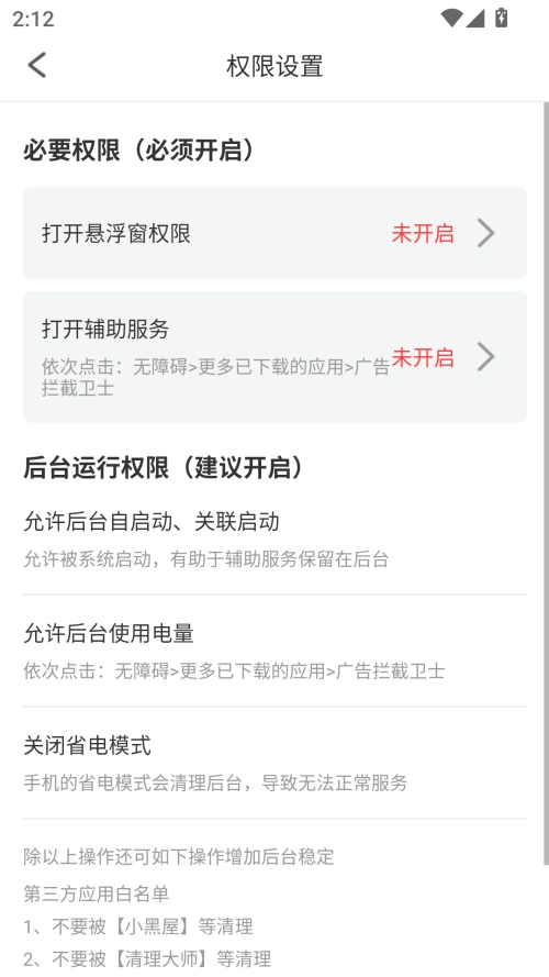 2、在权限管理页面,开启必要的权限,保证该软件的功能能够正常使用。