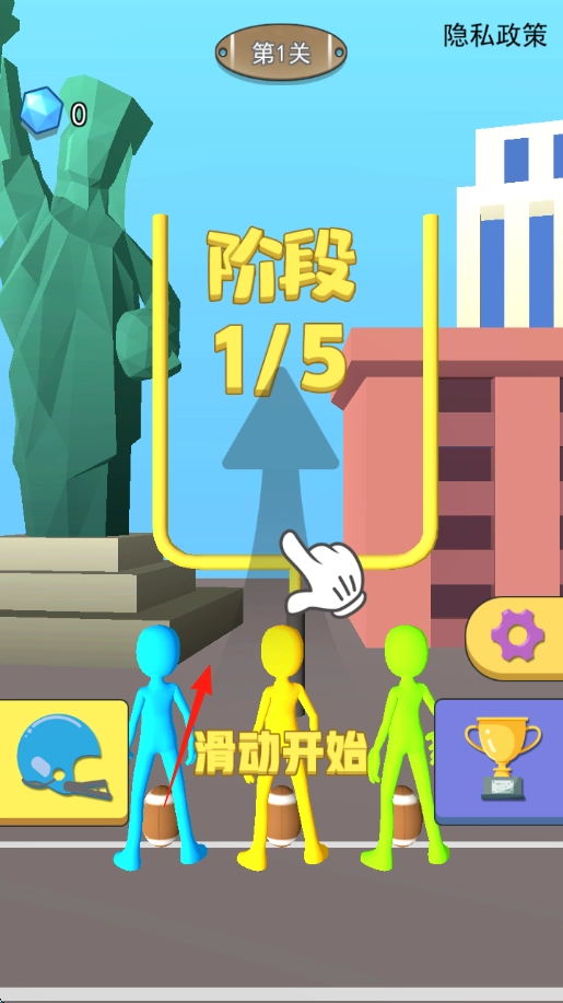 1. 游戏开局对应角色“第1关阶段1/5”,选择黄色火柴人,点击“滑动开始”。此时场景中出现自由女神像以及各类建筑,本关卡为美式橄榄球射门关卡。