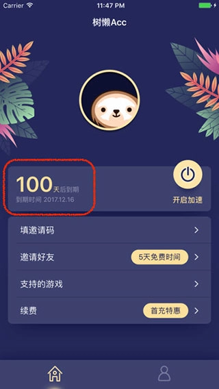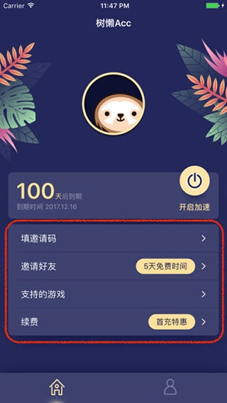 在核心操作区域的下方,集中了各类辅助性的主要功能模块。用户可以在此完成账户续费操作,查询树懒Acc当前支持网络优化的游戏列表,同时还能参与邀请好友相关的奖励活动。