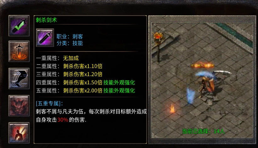 「潜行术」与「突袭术」双技联动,隐身瞬杀,一击致命;「癫狂刺术」开启后攻速暴增300%,三秒内以重伤效果完成收割,战场死神降临,令敌方闻风丧胆!
