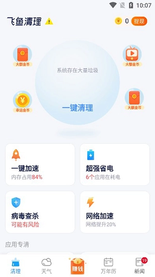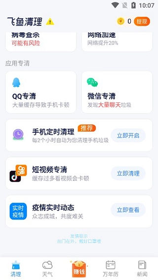这款名为飞鱼清理大师的软件实用性很强,它能帮助用户清理手机里的垃圾文件,还能同时处理手机中的病毒,从而释放更多内存空间。除了这些核心功能外,它还提供了查看天气预报、显示时间等附加服务,功能覆盖较为全面。