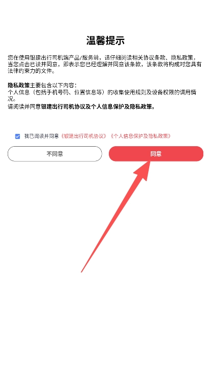 在温馨提示页面仔细阅读协议后点击“同意”按钮。