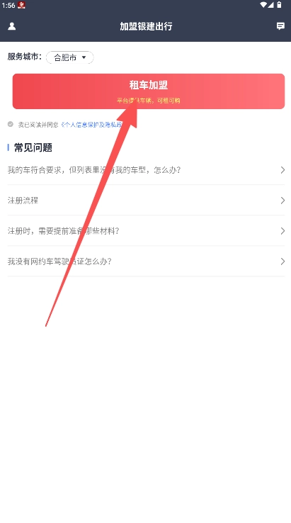 在加盟页面选定服务城市,勾选同意相关政策后,点击租车加盟按钮。