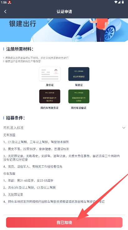 在认证申请页面查看完所需的材料和条件后,点击页面底部的“我已知晓”按钮。
