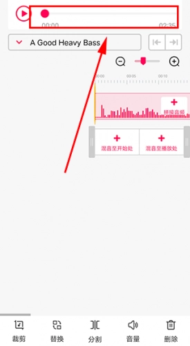 点击右下方的“裁剪”按钮就能对音频进行裁切操作,你可以借助锚点来调整裁剪的具体位置,另外也能通过时间选择器实现更精准的裁剪位置调整。