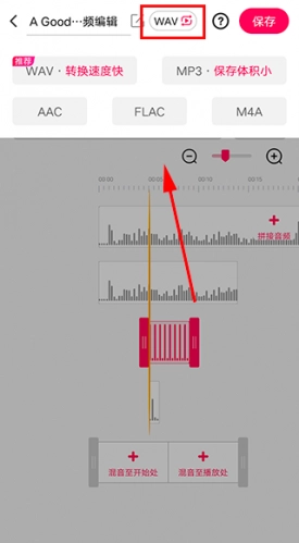 点击添加混音音频,按住音频首尾的手柄能够调节混音的音频时长,并且长按可以拖动来调整混音的位置。