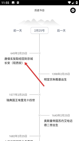 在日期选择界面,点击【2月25日】,即可跳转至该日期对应的历史事件列表页面。
