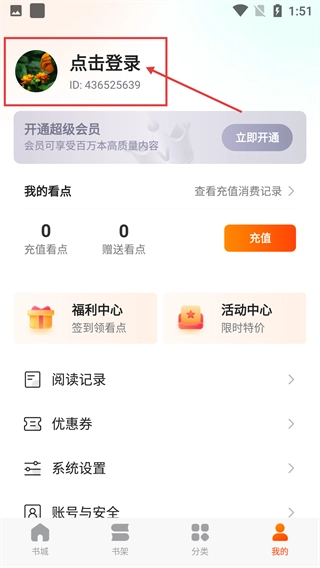 在个人中心页面,点击【点击登录】区域,进入登录界面,准备进行账号登录操作。
