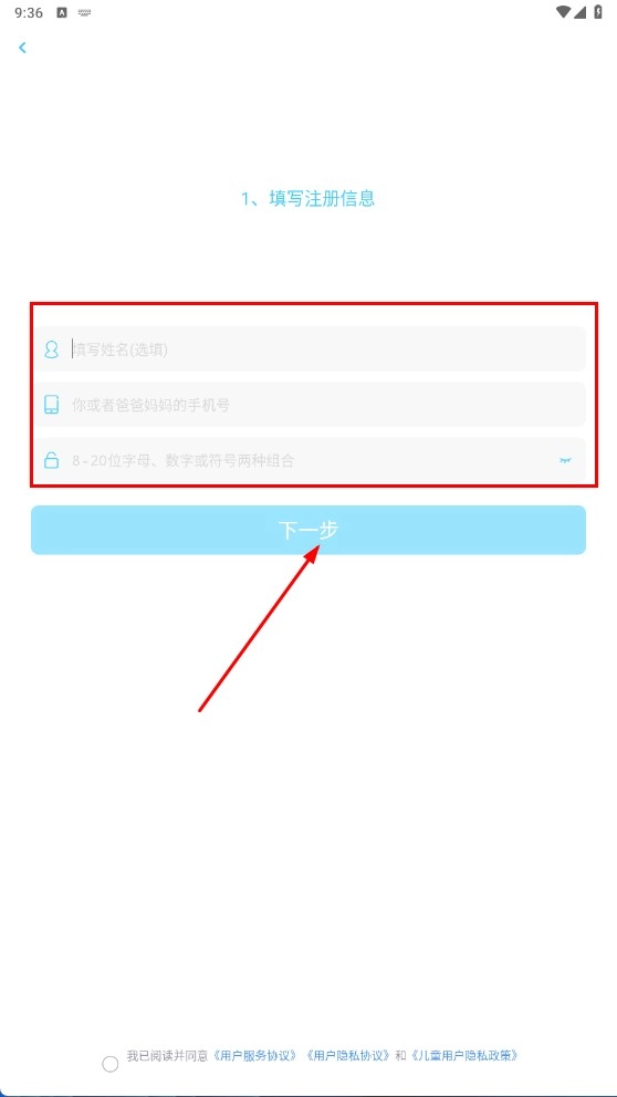 在注册页面填写姓名、手机号码和密码后,点击【下一步】功能按钮。
