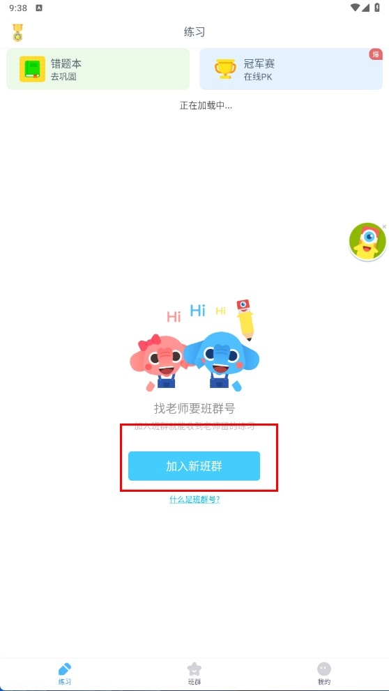 在练习页面,点击【加入新班群】功能按钮,即可进入班群加入页面。