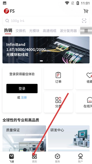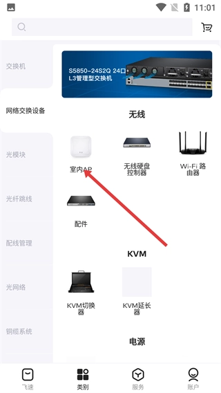 进入软件首页后,点击底部的【类别】按钮,就能进入产品分类页面,该页面包含交换机、光模块等各类产品的分类入口。
