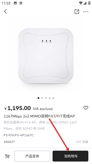 在室内AP产品列表里,当你点击像【1167Mbps-2x2-MIMO双频FAT/FIT无线AP】这类感兴趣的产品时,在进入产品详情页面之前,就能看到该产品的价格、到货时间等相关信息。