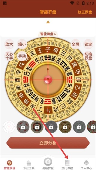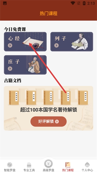 在智能罗盘页面,底部设有【热门课程】按钮,点击即可进入;此页面同时包含专业工具、高级罗盘等功能的入口,而热门课程板块则汇聚了国学经典课程与古籍资源。